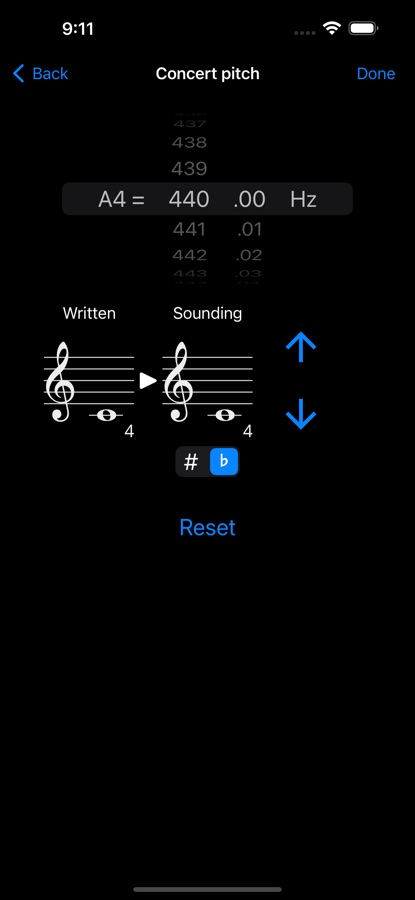 ● Transposition, concert pitch : You can change the most well-known tuning standard A4=440Hz. It also provides a transposition function for transposing instruments such as the clarinet, trumpet and saxophone.