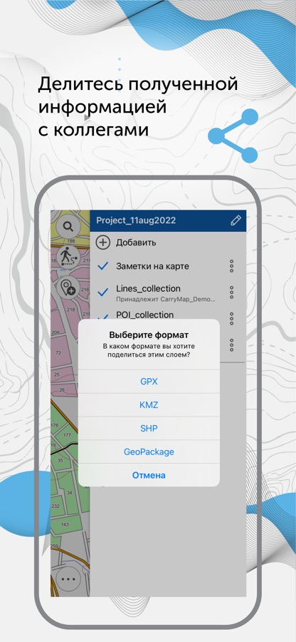 — Делитесь собранными данными в форматах GPKG (GeoPackage), KML/KMZ, GPX и SHP.