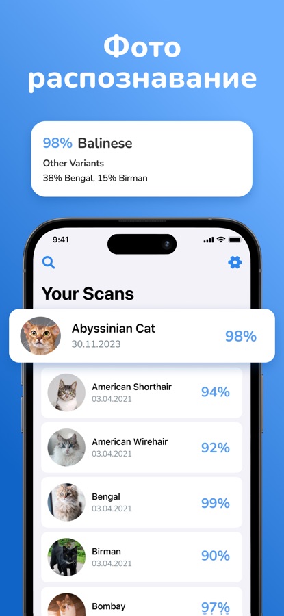 Узнайте породу кошки по фото! Направте камеру на фото и сделайте снимок. Много полезной информации такой как здоровье, уход, характер, история и факты. Наше приложение распознает до 80 пород. Для лучшей производительности постарайтесь сделать фото высокого качества с хорошим освещением без предметов или людей на фоне. Точность распознавания 85%.