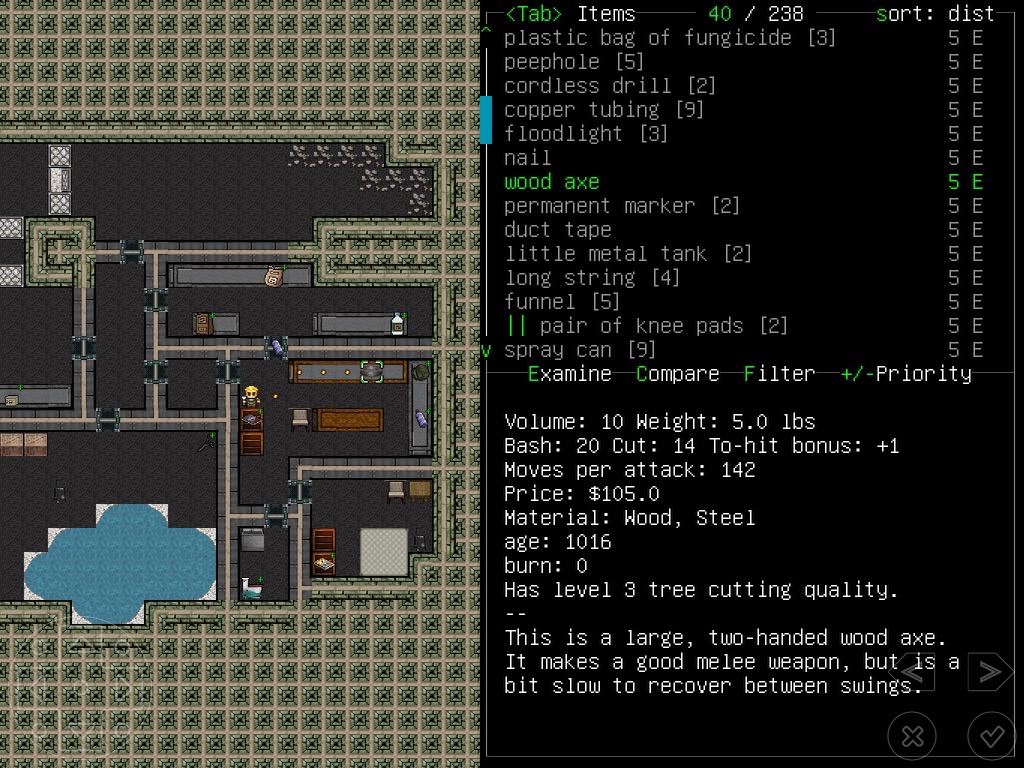 Unlike most roguelikes, it has no goal: the player is free to explore the procedurally generated map, clear areas of monsters, work with NPCs, and build shelters and vehicles.