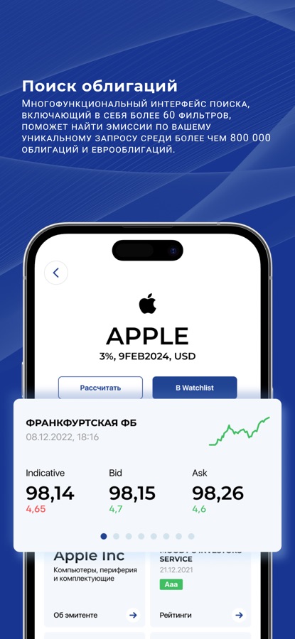 Ключевой функционал приложения Watchlist позволяет отслеживать информацию и котировки по избранному списку облигаций, акций и индексов. Добавление в список происходит через поисковую строку в разделе Watchlist или через страницы облигации, акции или индекса.