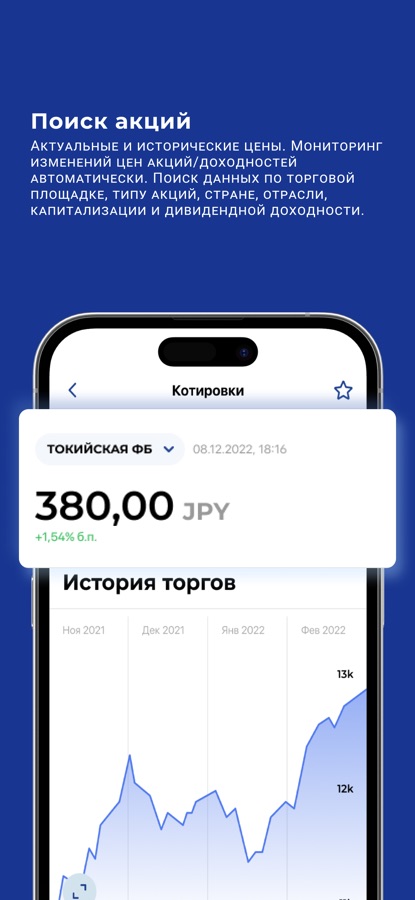 В приложении доступны быстрый поиск по акциям, облигациям и индексам, а также популярный аналитический инструментарий.
