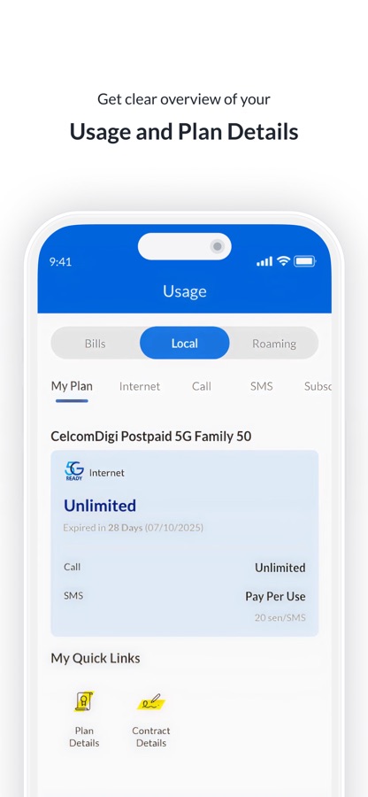 • Usage details: Overview of Internet plan, calls, SMS & roaming usages