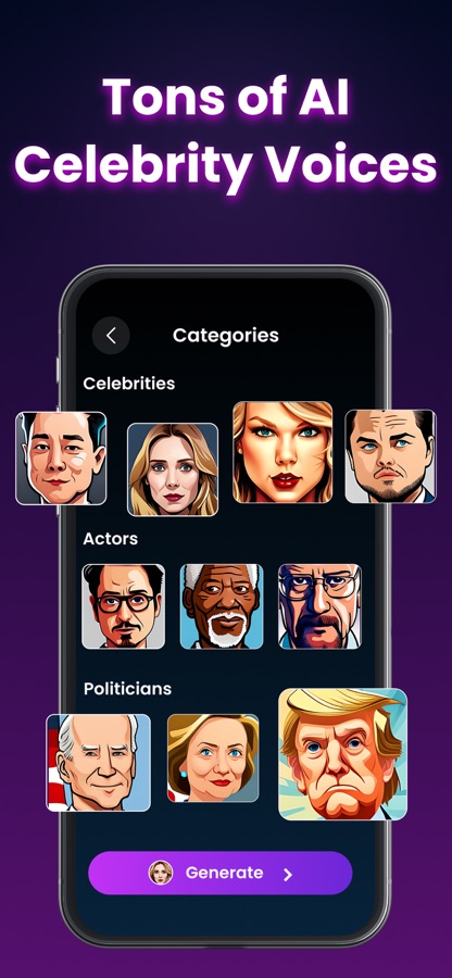 Преобразуйте ваши текстовые подсказки в реалистичные голоса ваших любимых знаменитостей: от известных политиков и любимых актеров до популярных музыкантов и трендовых инфлюенсеров. Выберите и сгенерируйте любой голос!