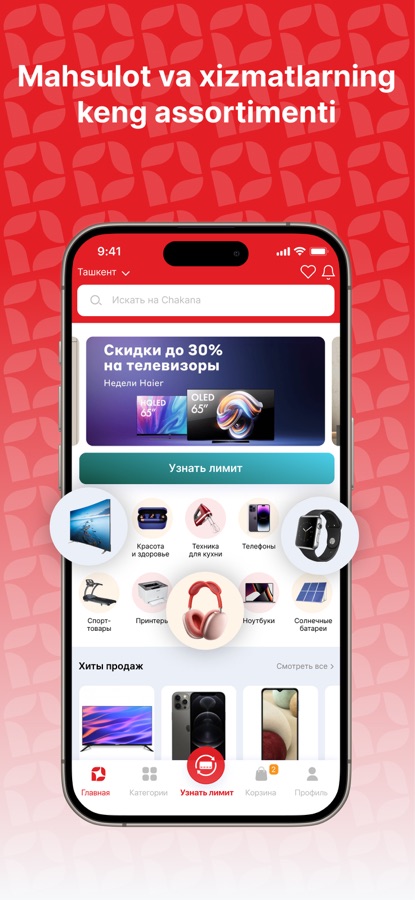 Для получения лимита на покупки в кредит необходимы только паспорт и зарплатная карта. Возможность оформить доставку по всему Узбекистану или самовывозом из магазина.