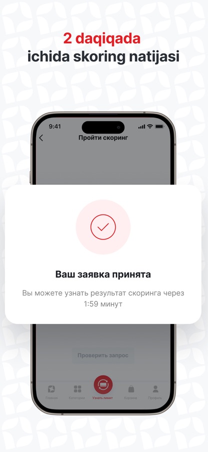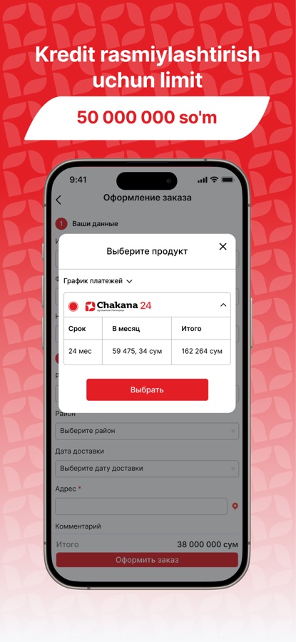 Kredit limitingizni bilish uchun sizga pasport va ish haqi kartasi kerak. O’zbekiston bo’ylab yetkazib berishni yoki do’kondan olib ketish imkoniyati mavjud.