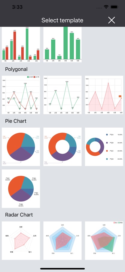 Быстро создавайте различные диаграммы, поддерживая типы диаграмм: линейные диаграммы, столбчатые диаграммы, линейчатые диаграммы, круговые диаграммы, диаграммы областей, диаграммы рассеяния, радиальные диаграммы, диаграммы полярных координат, тепловые карты, смешанные диаграммы, воронкообразные диаграммы и т. д., поддерживая пользовательские стили диаграмм.