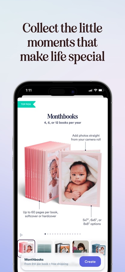 Our bestselling Monthbooks photo book subscription makes it easier than ever to turn your everyday moments into a stunning photo book collection. Simply choose your delivery schedule, cover style, and photo book size to get started. The best part? It only takes 5 minutes to print each 30-60 page photo book. Add photos right from your phone camera roll in the Chatbooks app, edit, and send to print in just a few taps. Cancel anytime and always enjoy free shipping on any Chatbooks photo book subscription.
