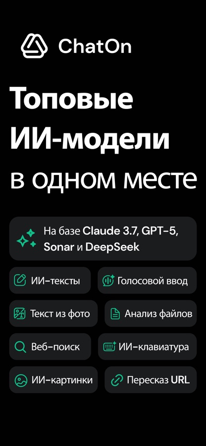 Построенный на базе передовых моделей GPT-5, Gemini 2.5 Pro, Sonar, Claude Sonnet и DeepSeek, ChatOn сделает ваше общение с ИИ легким, быстрым и максимально естественным. Если вы студент, которому нужна помощь с научной статьей, предприниматель, готовящийся к важной презентации, или копирайтер в поисках оригинального речевого оборота, ChatOn как раз то, что вам нужно!