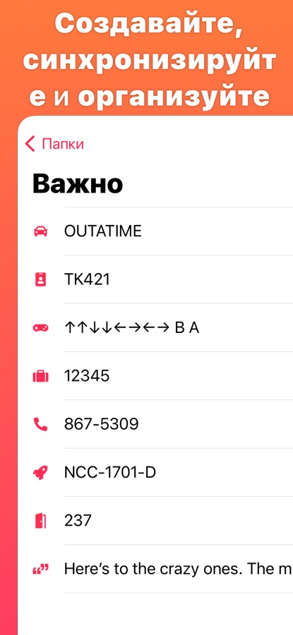 • Организация заметок в помощью папок и заголовков.