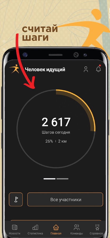 Наше приложение интегрировано с приложением «Здоровье» (the Health app) для отслеживания ваших шагов и пройденного расстояния и отображает их.