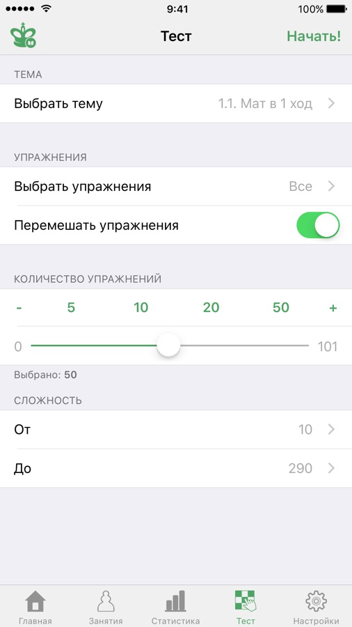 • Режим теста с гибкими настройками