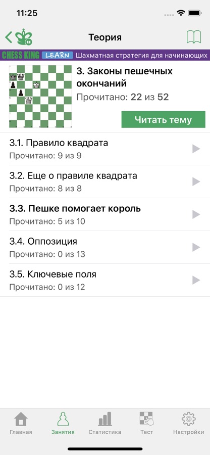 Также в программе содержится теоретический раздел, в котором поясняются методы игры в определенной стадии партии на реальных примерах. Теоретические уроки интерактивны, то есть вы можете не только читать текст уроков, но и делать ходы на доске и самостоятельно разбирать непонятные моменты.