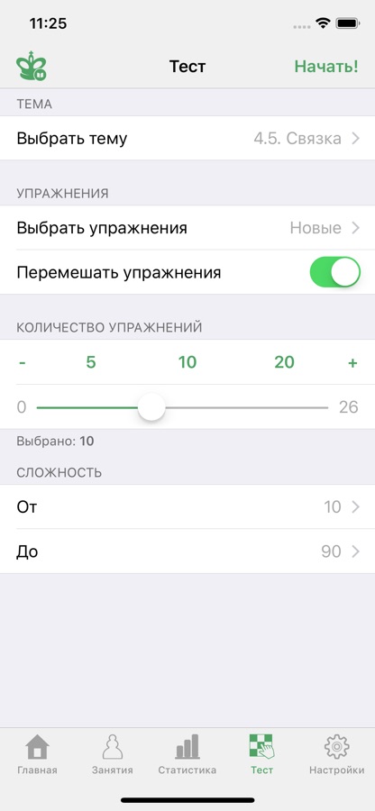 • Режим теста с гибкими настройками