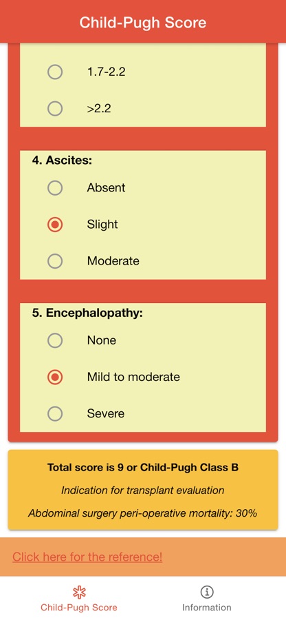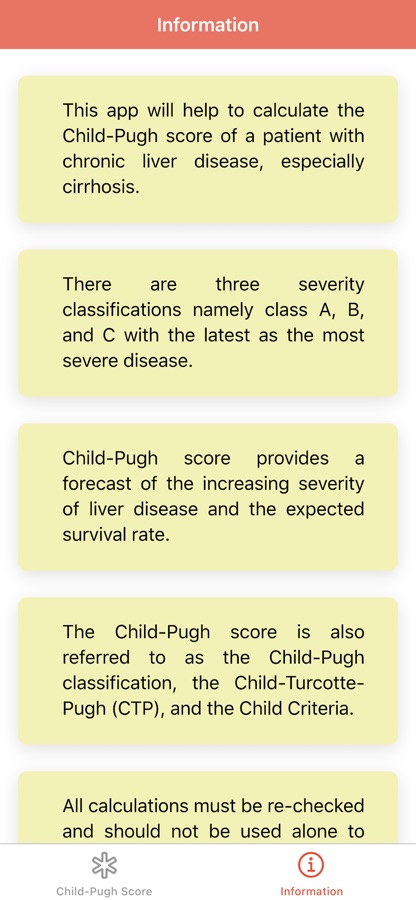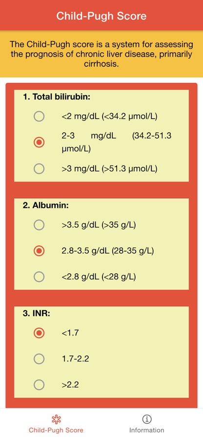 «Child Pugh Score Calculator — Liver Disease » is a mobile app designed to help medical practitioner to calculate the Child-Pugh score of a patient with chronic liver disease, especially cirrhosis. This «Child Pugh Score Calculator — Liver Disease» app will automatically classify the disease based on the total score. There are three classifications namely class A, B, and C with the latest as the most severe disease.