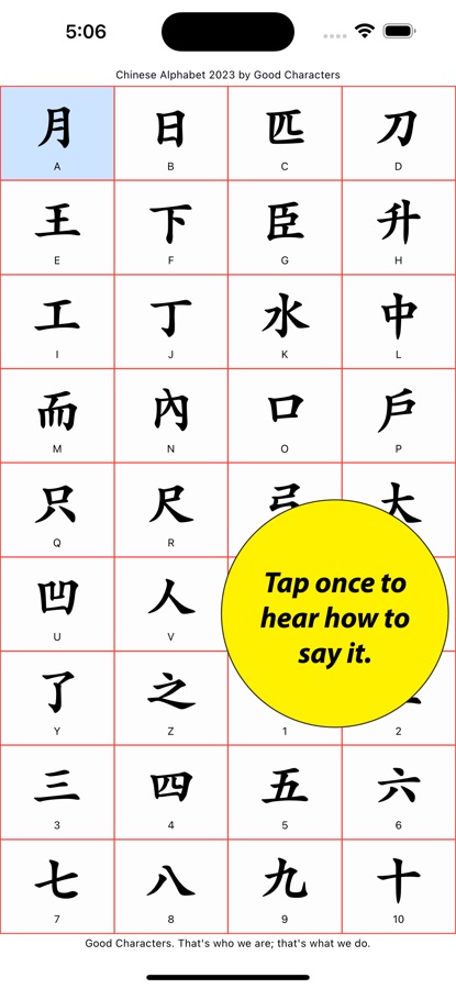 The purpose of this app is very simple. It is to be your quick reference for Good Characters’ Chinese “Alphabet” set. Simply touch the app icon and you’ll see a full set of “alphabet” characters.