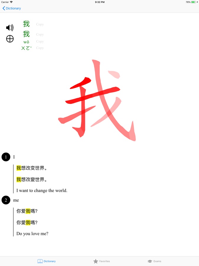 Карточки китайского словаря могут содержать аудио произношение, анимацию иероглифа, счетными слова и примеры.