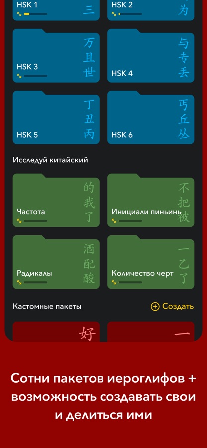 • Создавайте свои собственные пакеты путем поиска иероглифов по пиньинь. Вы даже можете смешивать пиньинь, русский язык и китайские иероглифы в одном запросе, чтобы найти как можно больше интересующих вас слов, и одним кликом добавлять их в пользовательский пакет.
