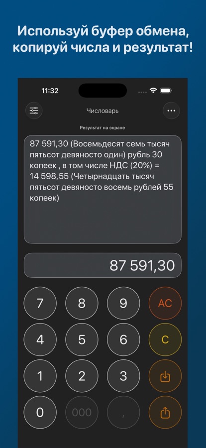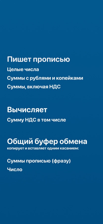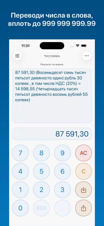 Вставьте число — получите готовый текст. Просто скопируйте сумму из любого места — калькулятора, таблицы, PDF-документа или даже с Mac — и вставьте в приложение. Чистый код без ИИ и интернета мгновенно выдаст безупречную прописную форму.