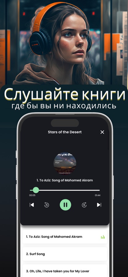 Слушайте любимые произведения в дороге, на прогулке или дома. Удобный аудиоплеер с управлением воспроизведением.