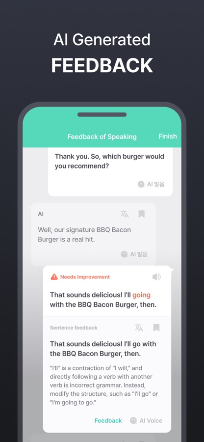 Легко и удобно научитесь говорить по-английски с помощью технологий ИИ. Вы можете свободно общаться с ИИ на интересующие вас темы. Она идеально распознает ваше произношение, позволяя вам вести диалог так, как если бы вы разговаривали с носителем языка. Коррекция грамматических ошибок и предложение улучшенных выражений являются данностью, а также предоставляются подсказки ответов, когда вы не можете подобрать слова.
