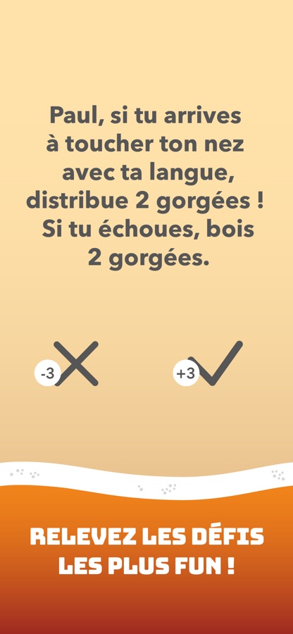 Chopine contient des centaines de gages et défis à boire, dont des gages de groupe, qui tombent aléatoirement. Pas question de se planquer, ce soir, tout le monde picole !