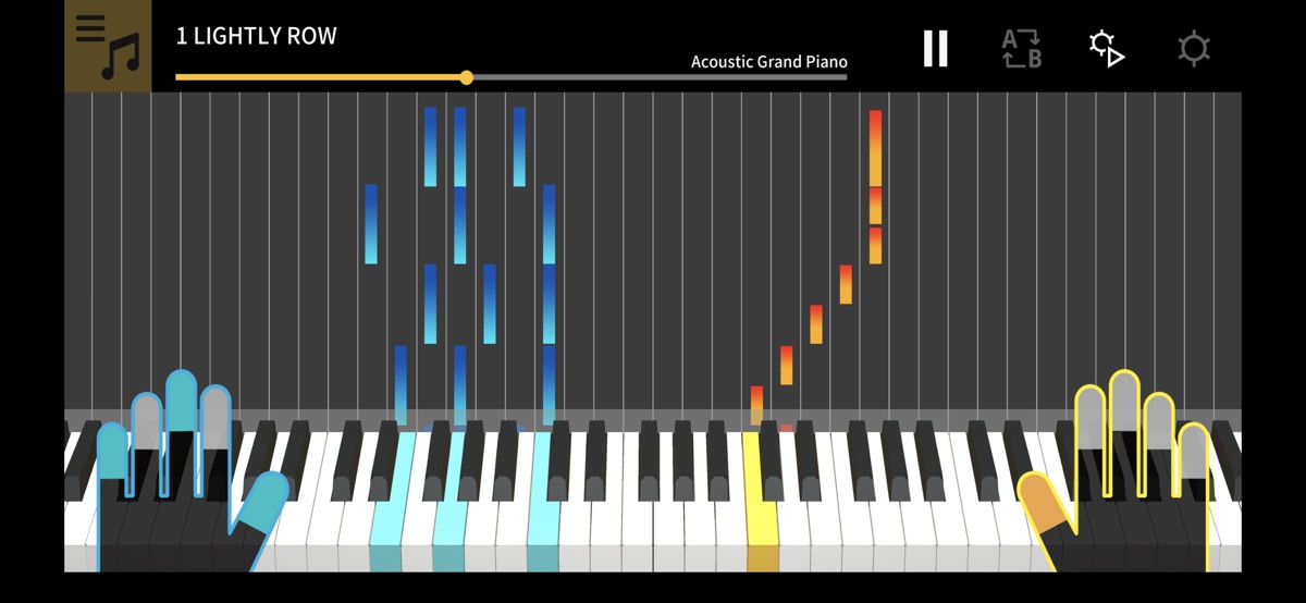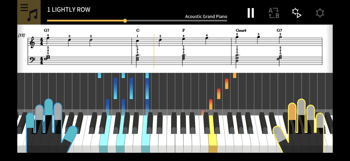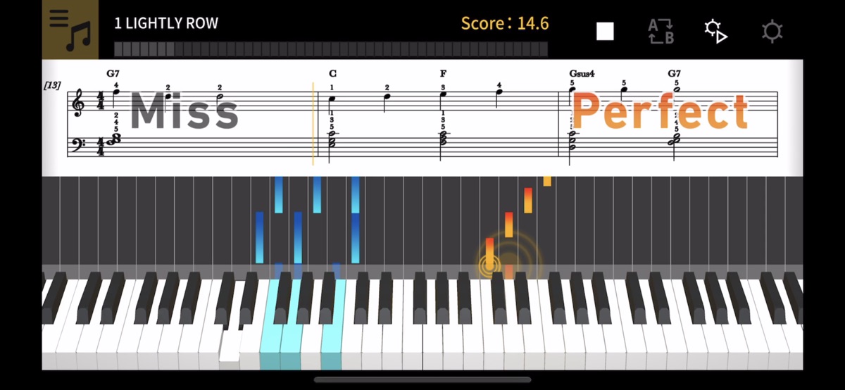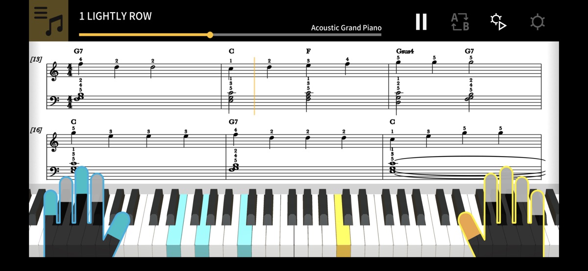 Chordana Play показывает партитуру, а также интерактивно отображает нотный текст (в виде подсказок, «падающих» на нужные клавиши) и имеет систему оценок — как для уже загруженных композиций, так и для файлов MIDI. В файлах MIDI можно выбрать, какие дорожки играть левой и правой рукой, или выбрать мелодию для правой руки, а созданные приложением аккорды — для левой. Замедляйте темп, транспонируйте партитуру в удобную тональность и используйте функцию повтора фрагмента, чтобы упражняться без спешки.