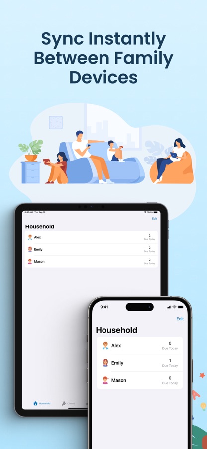 You can add multiple devices to your household. Each device can be set to Admin mode for parents, or child mode. Kid’s devices will only have access to their chore list and won’t be able to edit chores or balances.