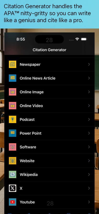 — Generate reference and in-text citations from 20 different source types, including artworks, audio files, books, blogs, Facebook content, government documents, journals, lectures, magazines, newspapers, online news articles, online images, online videos, podcasts, power point presentations, software, websites, Wikipedia content, X tweets, and YouTube videos.