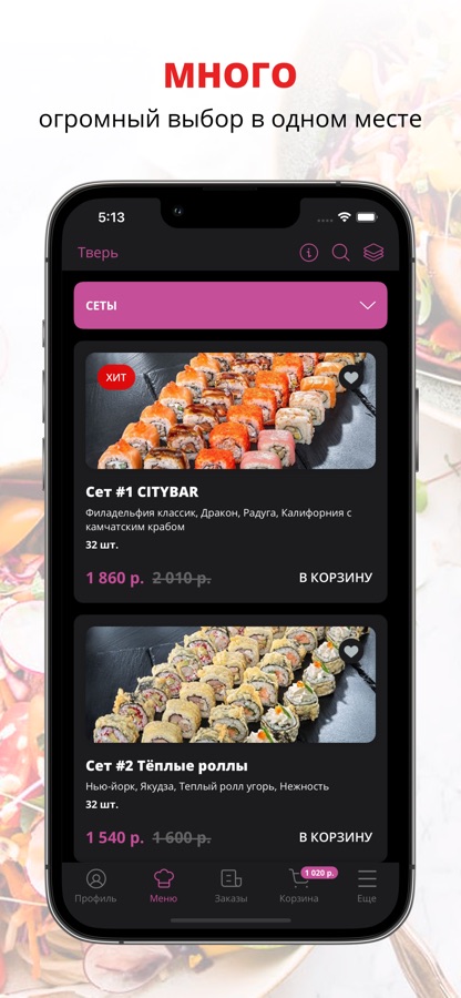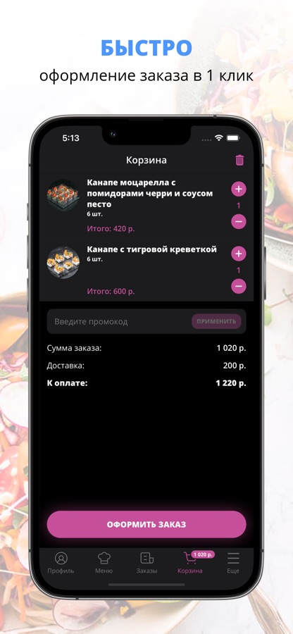 Скачивайте наше приложение, оформляйте заказ и наслаждайтесь вкусной едой! Один клик — и ты сыт!