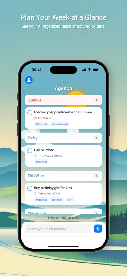— Clear & Actionable Task Views: See your structured tasks in intuitive views: Agenda for planning your week, Tag filters for focused work, and a clear list for your latest priorities.