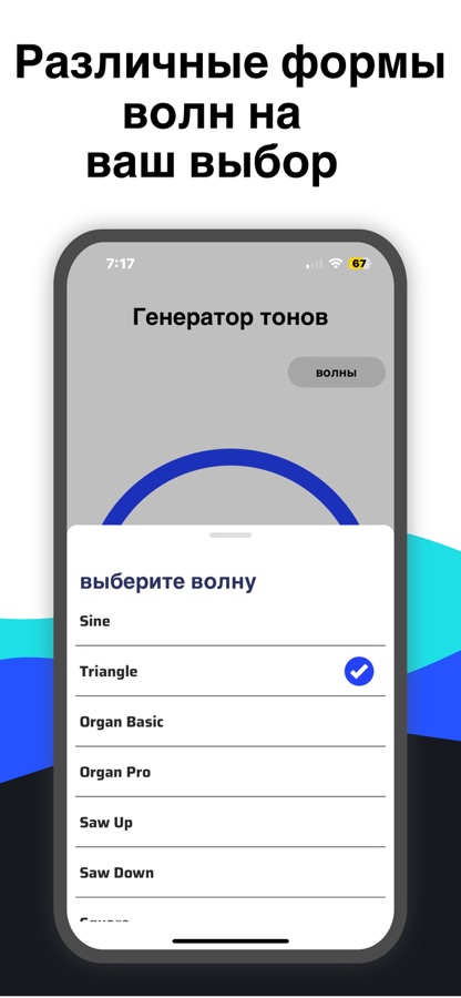 Выбор между 7 классическими формами волны: синусоида, прямоугольная, треугольная, пилообразная и другие