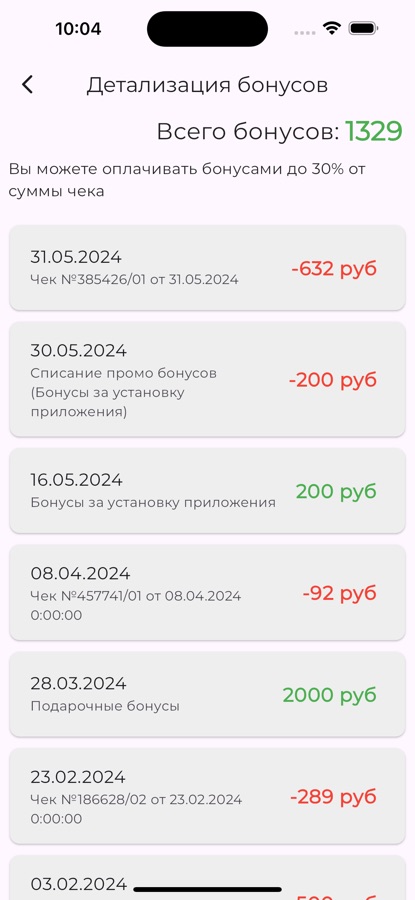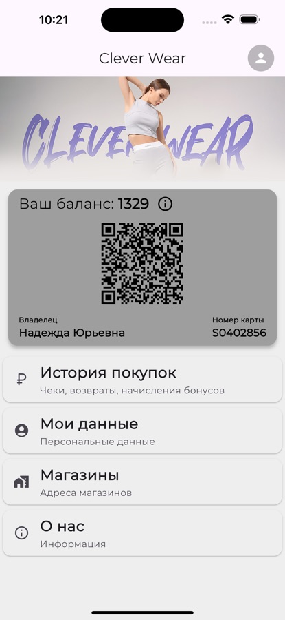 Просмотр бонусных баллов, начислений, покупок. Актуальный список магзаинов с режимом работы и контактными данными