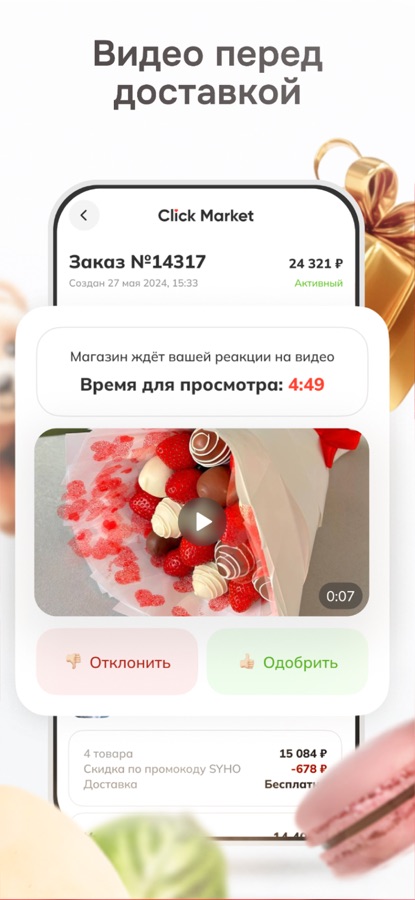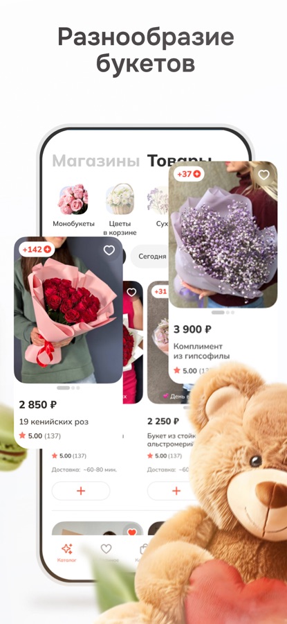 Внутри приложения более 1000 магазинов по всей России. Доставка готовых букетов, подарочных наборов, сертификатов, шариков, украшений, комнатных растений, цветов в горшках, тортов и сладостей и других товаров.