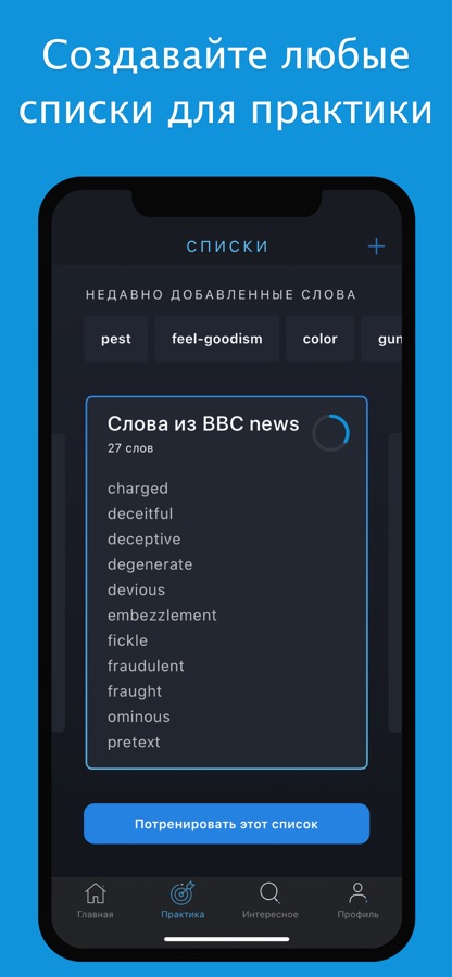 – Создавайте любые списки слов для практики.