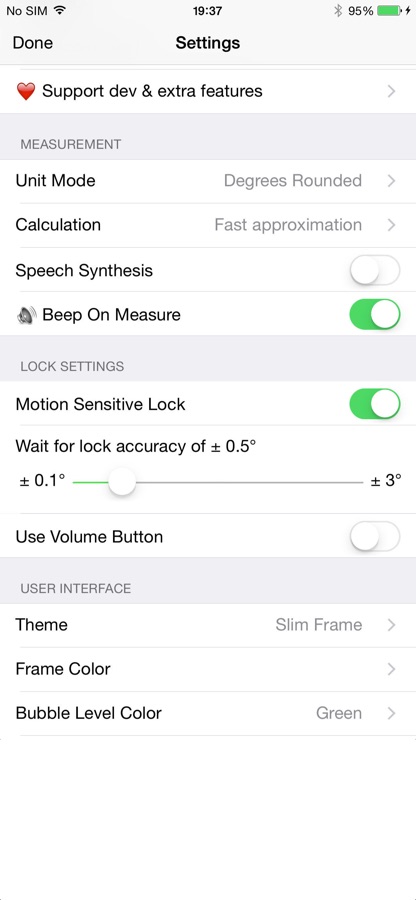 ◆ 3 Modes (incl. auto switching): Clinometer mode (auto when holding upright), Camera mode (any direction, manual activation) and Bubble level (smoothly fading in when holding flat).