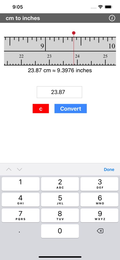 This is not your ordinary, run-of-the-mill cm to inches converter. This app does two tasks: In addition to converting your centimeters (cm) to inches, it also displays the result on a tape measure.