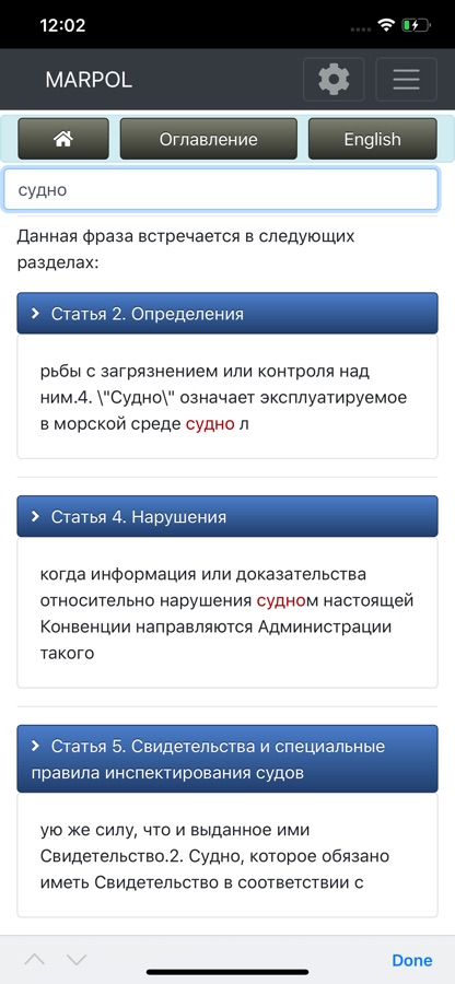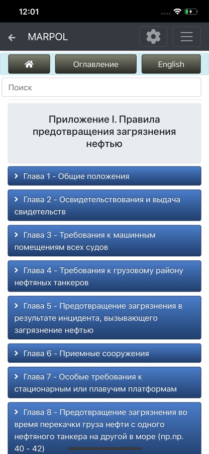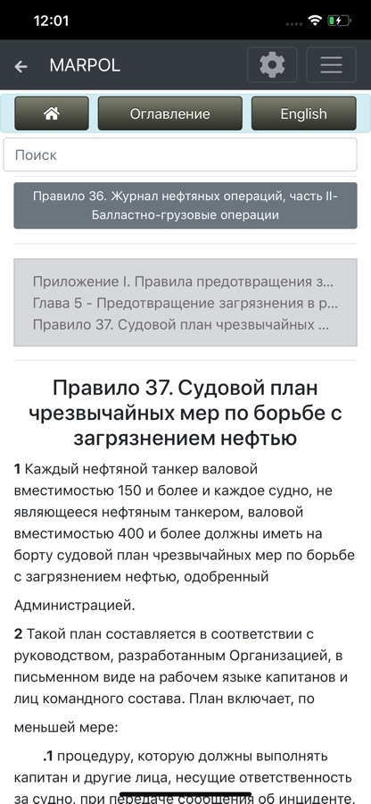 Приложение содержит полный текст конвенции МАРПОЛ (MARPOL 73/78) с последними поправками и дополнениями на двух языках (Русский, Английский). Приложение оснащено удобным поиском и навигацией по разделам конвенции.
