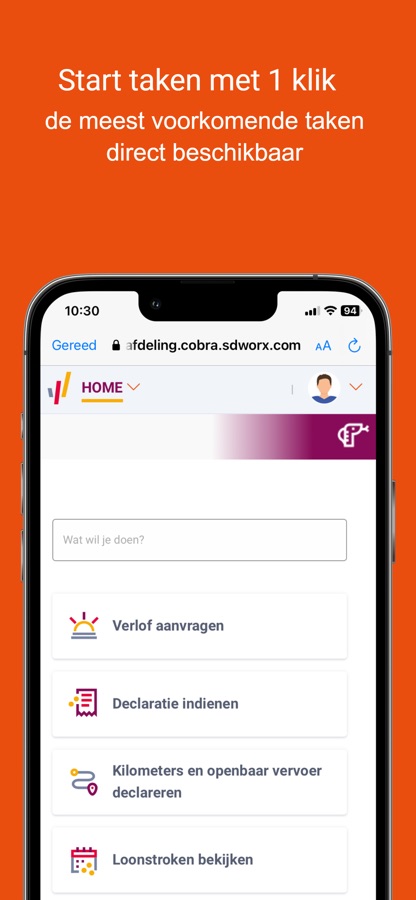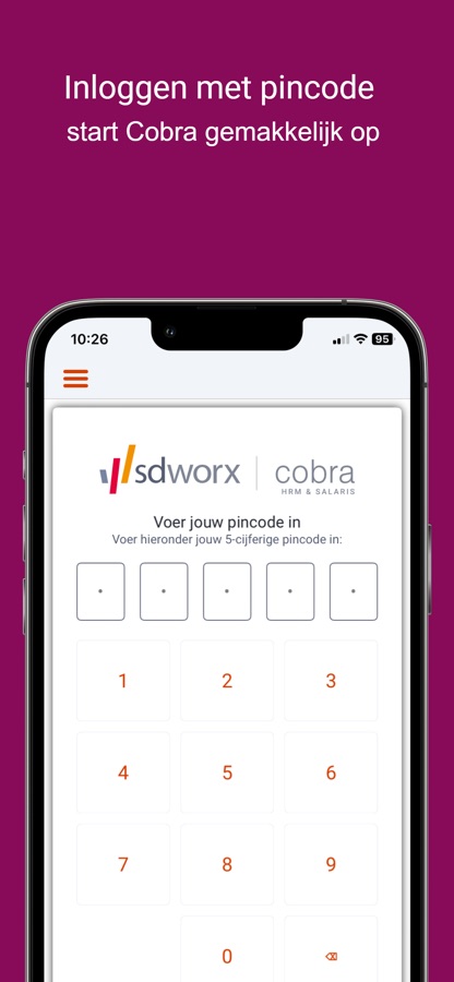 Met de Cobra app van SD Worx kun je op je telefoon of tablet op een beveiligde manier gemakkelijk inloggen in Cobra. Na het eenmalig invoeren van je inlognaam en wachtwoord kun je voortaan inloggen door alleen je pincode te gebruiken en notificaties ontvangen.