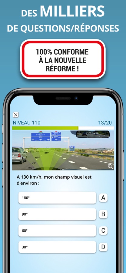 • Un mode Examen à tirage aléatoire reproduisant fidèlement les conditions de l’examen officiel du code de la route