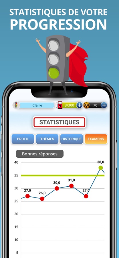 • Suivez votre progression thème par thème grâce aux statistiques et à votre historique