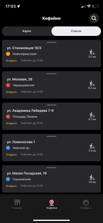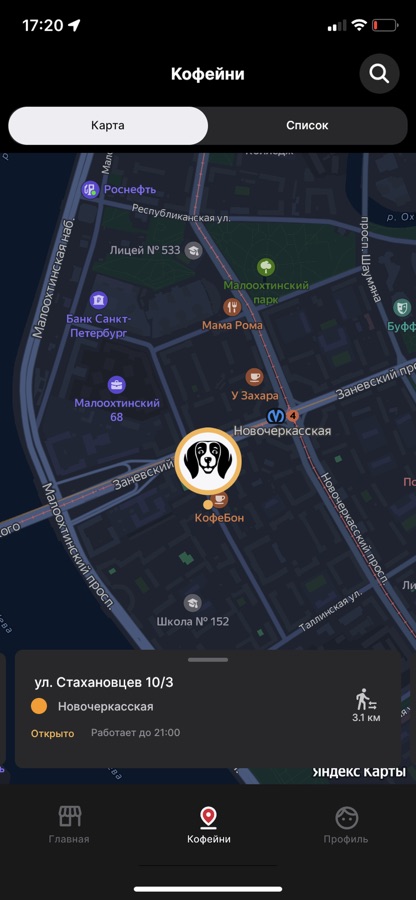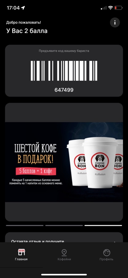 Карта лояльности всегда с тобой в приложении. Следи за бонусами, за которые сможешь получить ароматный кофе. А карта подскажет ближайшее кафе к тебе!