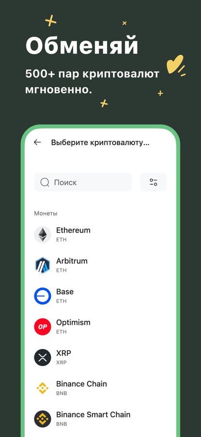 Кошелек позволяет легко обменивать одну криптовалюту на другую по выгодному курсу. Например, обменять биткоин на ethereum или ethereum на tether.