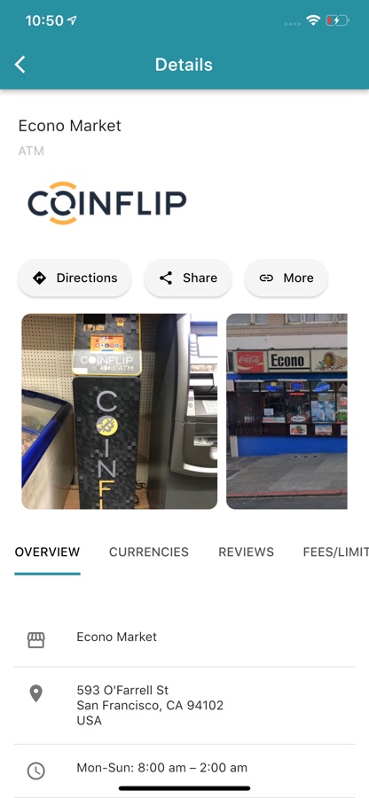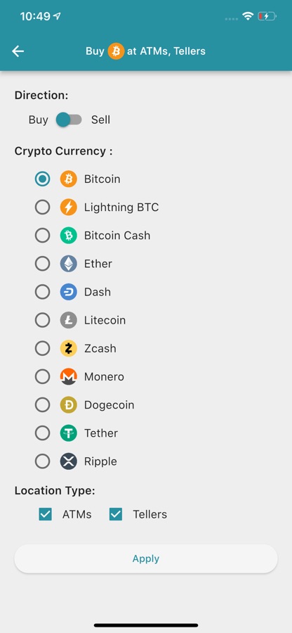 App allows to search for an ATM, Teller and Other service provider. You can filter and display locations by coin or by transaction type (buy or sell).