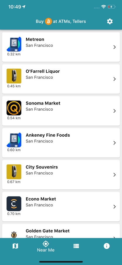 — Near me list: shows 20 closest ATMs and Tellers (where to buy or sell crypto for cash);