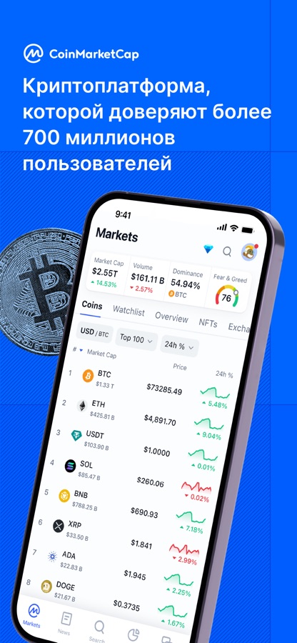 Отслеживайте избранные криптовалюты, например Bitcoin, Ethereum, XRP, EOS, Tron, и еще 2000+ монет и токенов, абсолютно бесплатно. В лучшем приложении о крипте есть всё, что вам нужно: рыночная капитализация, рейтинги, ценовые оповещения, графики торгов, трекер портфеля, конвертер валют, включая фиат; новости монет и токенов и инструменты для сравнения криптовалют. Точный курс Биткойна и альткоинов в реальном времени от самого надежного источника данных о криптовалютах.