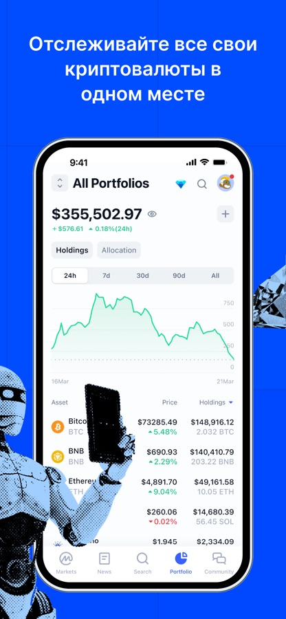 Следите за своим крипто портфелем и последними ценами на монеты, альткоины и токены, Bitcoin, Ethereum, XRP Ripple, Litecoin, Bitcoin Cash, EOS, Tether, Binance BNB, Stellar, Cardano, Monero, Doge и еще более 2000 других. Просмотр портфеля доступен в 90+ фиатных валютах, включая USD, EUR, JPY, KRW, CNY, криптовалютах, включая BTC, ETH, XRP, LTC, и драгметаллах, включая золото и палладий. Отслеживайте состояние и эффективность инвестиционного портфеля с CoinMarketCap. Совершая новые транзакции, обновляйте информацию о своих активах в один клик в нашем удобном интерфейсе.