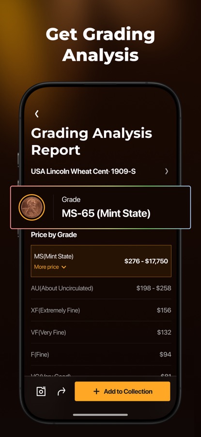 Access coin grading reports with detailed breakdowns and estimated market values.