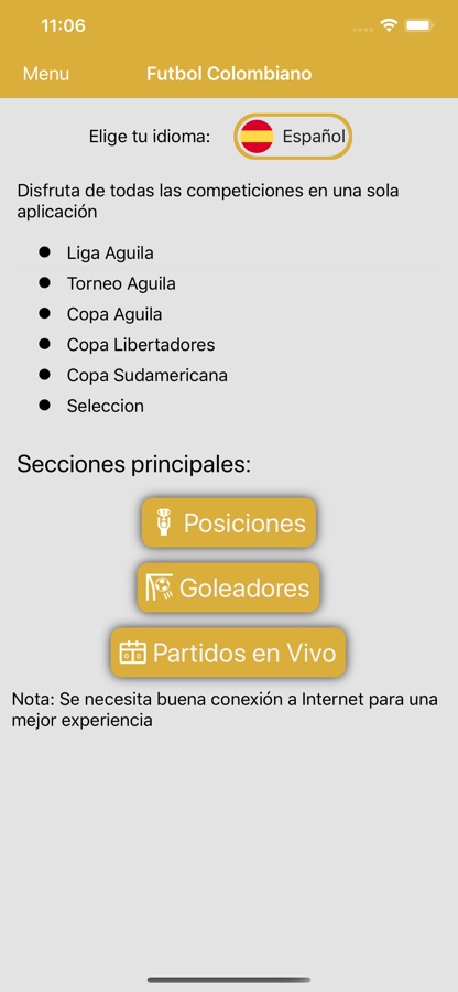 La aplicación de Fútbol Colombiano te permite seguir en vivo todas las competiciones profesionales del fútbol de Colombia gratis y online. A su vez puedes seguir las competiciones internacionales de Latinoamérica (Copa Libertadores y Sudamericana) y los partidos de la selección de Colombia. También se brinda toda la información relevante de las competiciones: tabla de posiciones, tabla de goleadores y mucho más.