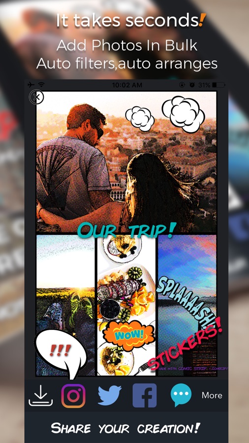 Comic Strip allows you to bulk select images and it then auto filters, auto arranges for speedy results, after that you get to do the fun part, add filters, stickers, text bubbles, titles, play with fonts and colors and share it with people close to you.